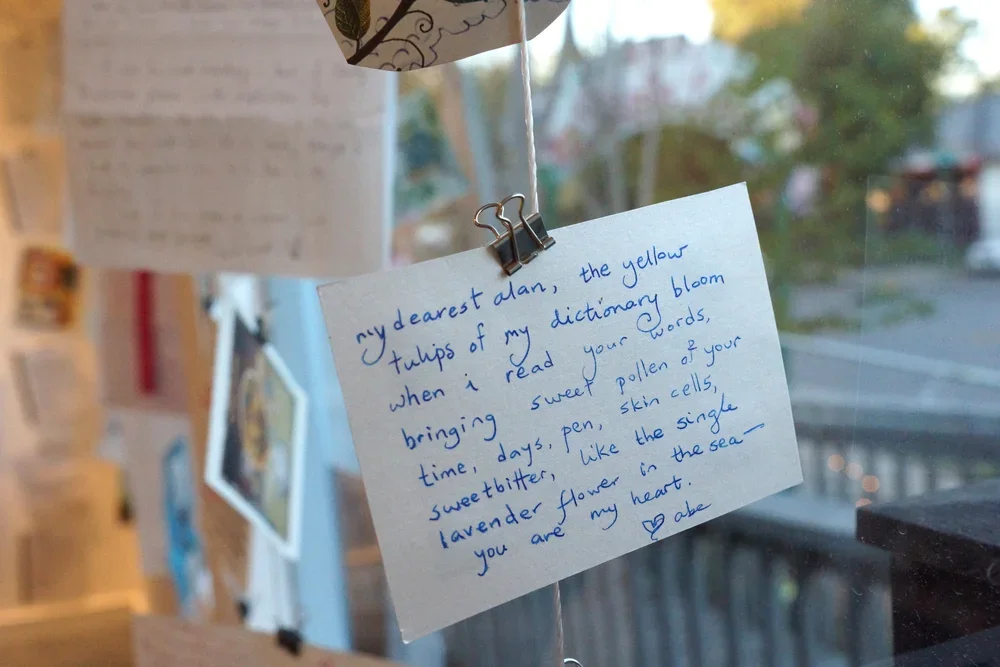 Chicago poet Alan Shefsky and I wrote to each other nearly every day for thirteen years, and exchanged over 3,000 intimate, playful, often-rhyming letters and ephemera. Alan died in 2014. At that time, I created an art installation that displays 200 of those mailed pieces, which viewers can read and touch. It also offered a public letter-writing station filled with letter-writing prompts. Visitors wrote over 400 letters, which I stamped and mailed to their recipients all over the world.